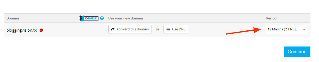Set up DNS or domain forward, you can do it later too. Select period to 12 months and continue.